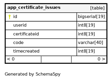 | id | bigserial | 19 | √ | nextval('app_certificate_issues_id_seq'::regclass) |