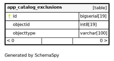 | id | bigserial | 19 | √ | nextval('app_catalog_exclusions_id_seq'::regclass) |
