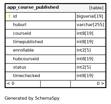 | id | bigserial | 19 | √ | nextval('app_course_published_id_seq'::regclass) |